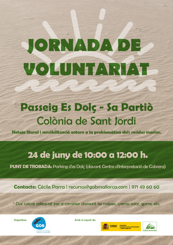 Voluntariat El proper dimecres 24 de juny de 10 a 12h serem a la platja d'Es Dolç (Colònia de Sant Jordi) realitzant una neteja de litoral. Ens trobarem a les 10 a l'aparcament situat davant el centre d'interpretació del Parc Nacional de Cabrera. Participa!