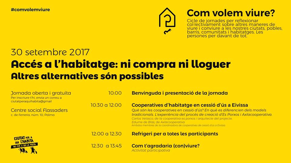 Dissabte 30 de setembre. Xerrada "Accés a l'habitatges, ni compra ni lloguer. Altres alternatives són possibles". Al centre social Flassaders. Inscripció a Aquesta adreça de correu-e està protegida dels robots de spam.Necessites Javascript habilitat per veure-la.. ![]()