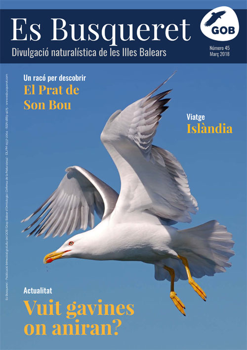 Es Busqueret Acabam de publicar el número 45 de la nostra revista de divulgació naturalística, en la que podràs trobar uns continguts ben interessants. Sabies que algunes de les nostres gavines passen l'hivern al Cantàbric i a l'Atlàntic? Coneixes el Prat de Son Bou? T'has fixat en els girapedres, habituals en alguns trams de costa fins i tot urbans? Què fan les aus quan arriba un huracà? Tot això i molt més, en Es Busqueret. |