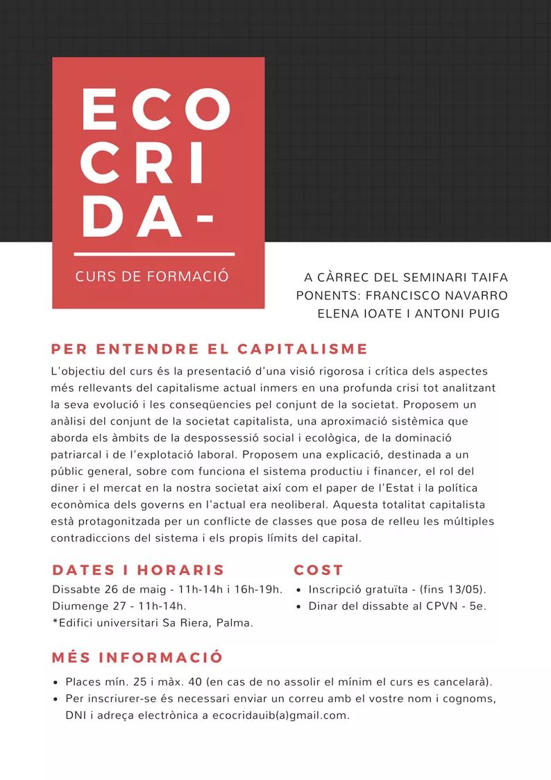 Dissabte, 26 de maig. Curs de formació "Per entendre el capitalisme". A l'edifici universitari de sa Riera. Més informació i inscripció a Aquesta adreça de correu-e està protegida dels robots de spam.Necessites Javascript habilitat per veure-la.. ![]()