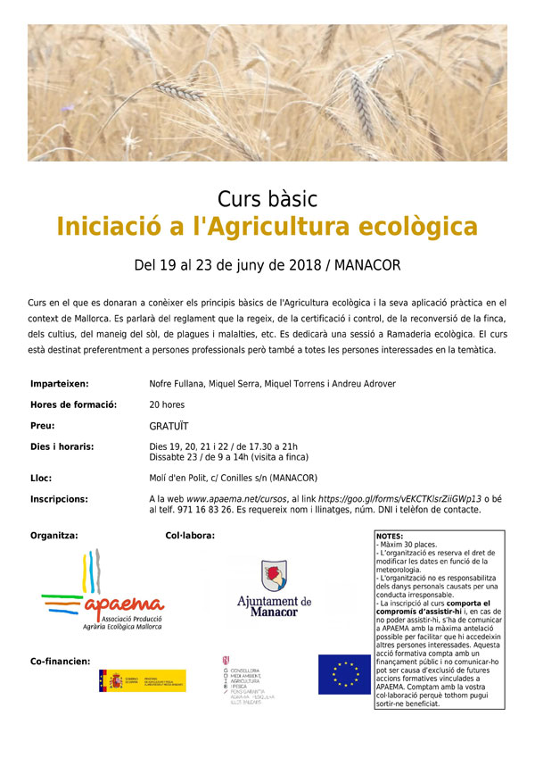 Del 19 al 23 de juny. Curs d'iniciació a l'agricultura ecològica. Curs gratuït, de 20 hores. A Manacor. ![]()