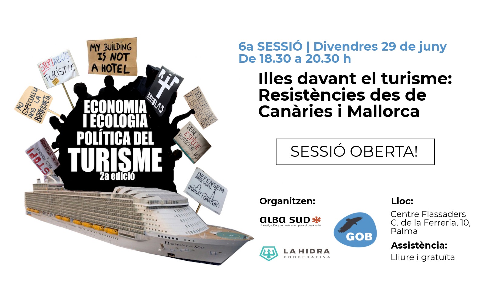 Divendres 29 de juny, 18:30h. Darrera sessió del curs d'Economia i ecologia política del turisme, gratuïta i oberta a tothom. Illes davant el turisme: resistències des de Canàries i Mallorca. Al nostre local. ![]()