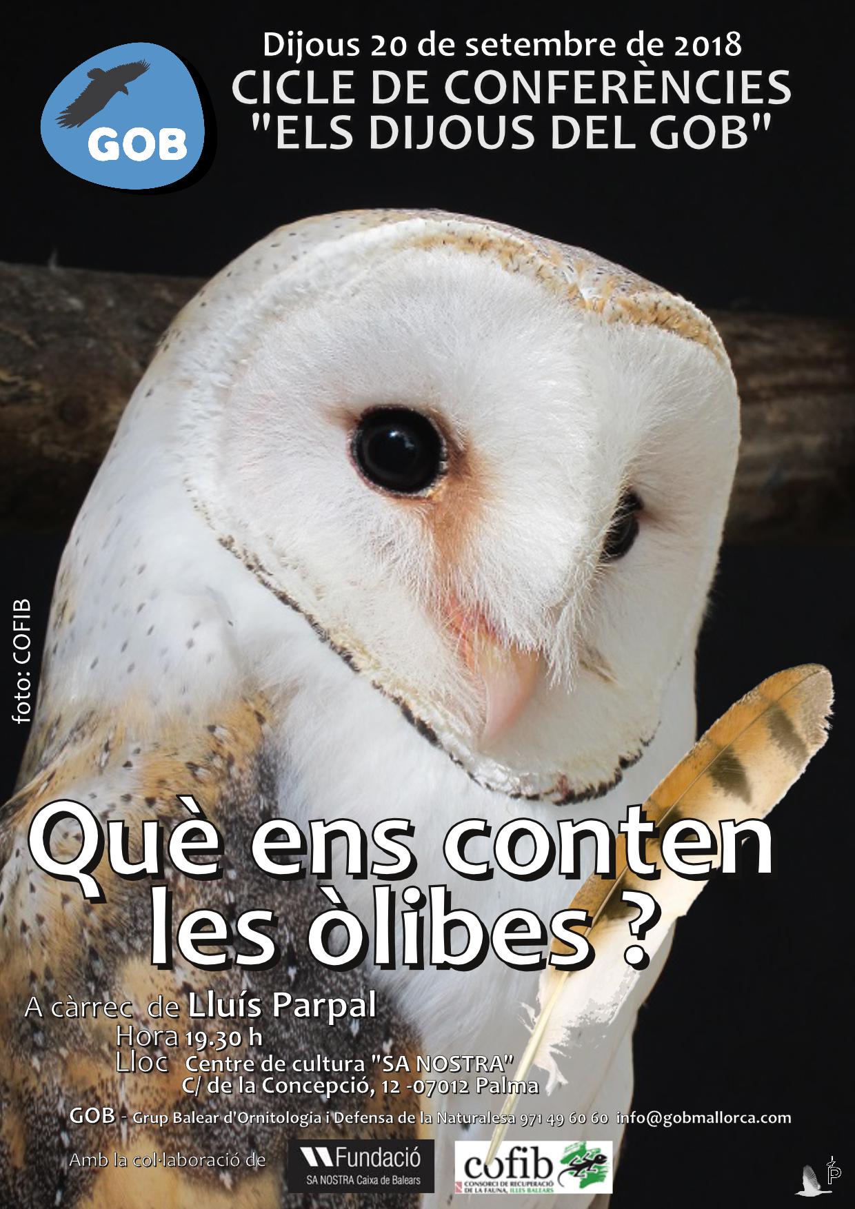 Dijous 20 de setembre, 19:30h. Cicle de xerrades "els dijous del GOB": Què ens conten les òlibes? ATENCIÓ: LES XERRADES HAN CANVIAT DE LLOC. A partir d'ara, generalment al Centre de Cultura "Sa Nostra", c/ Concepció, 12, Palma. ![]()