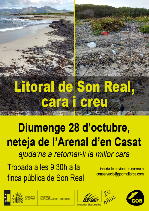 Diumenge 28 d'octubre, 9:30h. Neteja de l'Arenal d'en Casat, Son Real. Ens trobarem vora el centre d'informació de la finca pública. ![]()