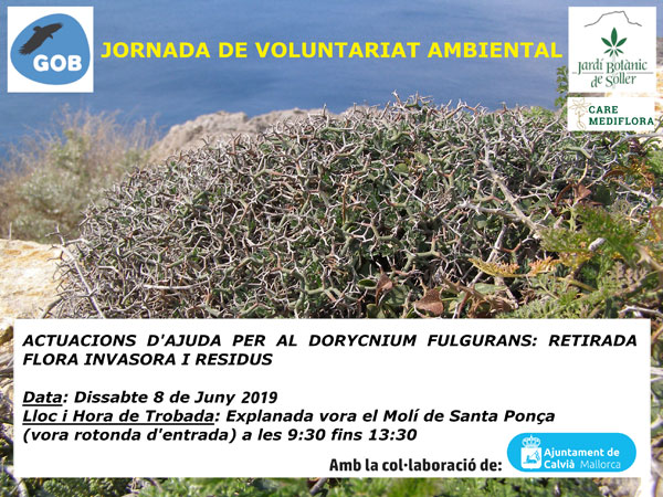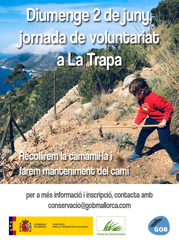 Agenda recomanada Dijous 30 de maig, 19:30h. Presentació del llibre "Flora dels canons càrstics de la Serra de Tramuntana. Al nostre local. ![]() Diumenge 2 de juny, 9h. Jornada de voluntariat a la Trapa. Darrera jornada mensual abans de la pausa d'estiu. Trobada per fer cotxades a les 9h a l'aparcament de l'Ocimax de Palma, a la part de darrera devora el Media Markt, o si vens directament a Sant Elm ens veurem davant el bar Es Molí (avinguda de la Trapa) a les 10h. La jornada acaba a les 14h. ![]() Diumenge 2 de juny. Sortida botànica i ornitològica pel camí dels Horts de Caimari. La tornam a programar, després que el passat 25 de maig fos suspesa per pluja. Dissabte 8 de juny, 9:30h. Jornada de voluntariat, retirada de flora invasora i residus per ajudar al Dorycnium fulgurans. Més informació i inscripció a Aquesta adreça de correu-e està protegida dels robots de spam.Necessites Javascript habilitat per veure-la.. ![]() |