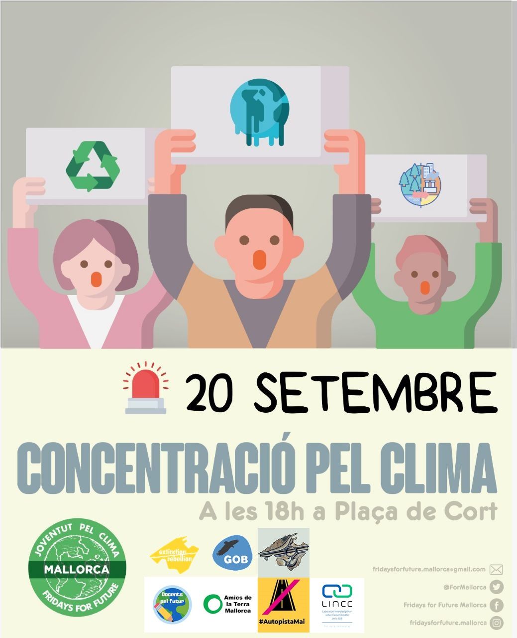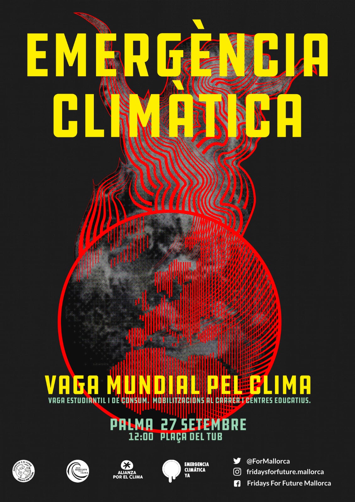 Actes per l'emergència climàtica Els propers dies 20 i 27 de setembre ens veim als carrers per reclamar la responsabilitat de fer front al canvi climàtic. Lluitam per un futur on la vida estigui al centre, per un món on la justícia climàtica no sigui desconeguda per qui la mereix. Per reclamar compromisos i accions reals més enllà de les declaracions de bones intencions. Per exigir posar en qüestió el sistema que mata la vida. Per tot això i més, surt al carrer! |