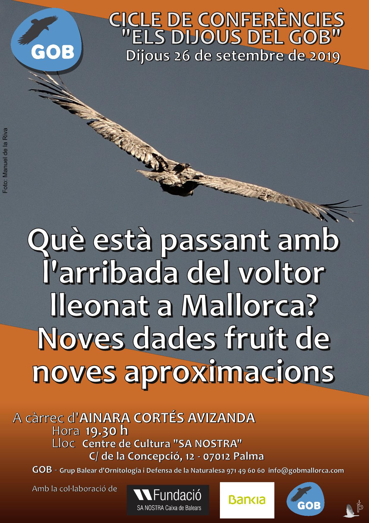 Agenda recomanada Dijous 26 de setembre, 19:30h. Projecció i xerrada del cicle "els dijous del GOB": Què està passant amb l'arribada del voltor lleonat a Mallorca? Al Centre de Cultura sa Nostra, Palma. ![]() Divendres 27 de setembre. Vaga mundial pel clima. Concentració a les 12h a la plaça del Tub, Palma. ![]() Dijous 10 d'octubre, 19:30h. Projecció i xerrada: Svalbard, al Nord del Nord. A càrrec de Josep Manchado. Al nostre local. ![]() |