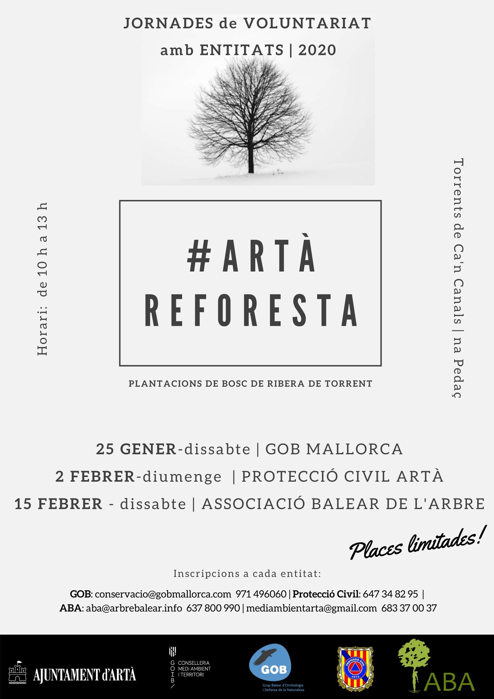 Reforestació de torrents a Artà. Començam dissabte 25 de gener Per tal de prevenir els efectes ambientals i socials de les pluges torrencials, es planteja aquesta iniciativa municipal que té per objectiu incrementar la cobertura arbòria de torrents i capçaleres de conca hidrogràfica. S'han planificat actuacions amb diverses entitats, com veuràs al cartell adjunt. La primera de les jornades serà el 25 de gener de 10 a 13h quan actuarem a la finca dels Olors, a la capçalera del torrent de na Pedaç. Cal inscripció prèvia a Aquesta adreça de correu-e està protegida dels robots de spam.Necessites Javascript habilitat per veure-la., on te donarem detalls de lloc i hora de trobada, a més d'altres detalls.