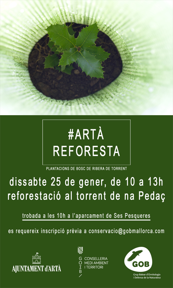 Voluntariat Reforestació de torrents a Artà. Començam dissabte 25 de gener Per tal de prevenir els efectes ambientals i socials de les pluges torrencials, es planteja aquesta iniciativa municipal que té per objectiu incrementar la cobertura arbòria de torrents i capçaleres de conca hidrogràfica. S'han planificat actuacions amb diverses entitats, com veuràs al cartell adjunt. La primera de les jornades serà el 25 de gener de 10 a 13h quan actuarem a la capçalera del torrent de na Pedaç. Cal inscripció prèvia a Aquesta adreça de correu-e està protegida dels robots de spam.Necessites Javascript habilitat per veure-la., on te donarem detalls de lloc i hora de trobada, a més d'altres detalls.