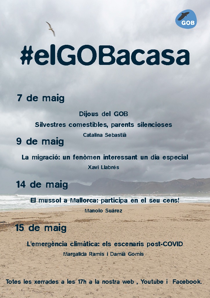 El GOB, en directe La setmana passada vàrem encetar aquesta nova línia informativa i participativa amb la xerrada sobre la recuperació de la milana, que per si no la vàreu poder veure en directe la podeu visualitzar en qualsevol moment al nostre canal de youtube. Per aquesta setmana tenim altres dues sessions previstes. Dijous 7 de maig, a les 17h, xerrada sobre plantes silvestres comestibles, realitzada per Catalina Sebastià. I dissabte 9 de maig, a les 17h, per celebrar el dia mundial de les aus migratòries, xerrada "La migració: un fenòmen interessant un dia especial" a càrrec de Xavier Llabrés. Aquí tens, també, la previsió de les properes emisions: