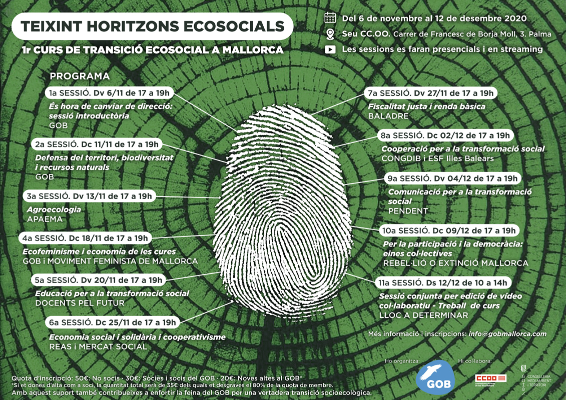 Les Illes Balears s’enfronten a uns reptes majúsculs després de la crisi sanitària de la COVID19. Cal ara mateix, aportar des de la perspectiva de l’ecologisme social, una resposta als reptes econòmics, socials i ambientals que s’han fet ara més evidents que mai. Les Illes, com el món sencer, es troba en una cruïlla en la que sembla que s’ha d’escollir entre reactivar l’economia o la preservació de la vida. Des de l’ecologisme volem aportar propostes a aquest dilema i aportar arguments i propostes concretes des de diferents àmbits per poder transitar cap a un model que garanteixi l’equilibri d’un metabolisme sa, entre la conservació dels recursos naturals (com l’aigua) i la biodiversitat, els impactes i residus generats pel sistema, revisant les pautes de consum i el model que ens ha abocat a la situació actual. Des del GOB hem volgut impulsar un curs de formació en els temes pilars del que considerem que ha de ser la transformació ecosocial que ens ha ajuntat sota el paraigües de La Vida al Centre (el manifest de propostes per a la transició ecosocial): www.lavidaalcentre.org Aquí et podràs informar sobre el programa i la inscripció |