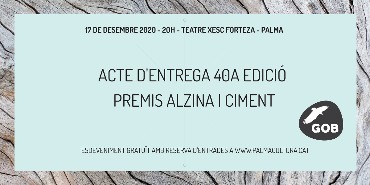 Aquests premis reconeixen entitats, col·lectius o persones que han destacat durant l'any per la seva implicació en la protecció i conservació del territori i la biodiversitat de Mallorca, així com la tasca negativa d'entitats o persones envers el medi ambient, en la categoria dels premis Ciment. A continuació tindrà lloc la projecció del documental “El Temps que Resta” de Observatori del Deute en la Globalització - ODG https://www.youtube.com/watch?v=U9T7nmczHJE L’acte és gratuït i tindrà lloc al Teatre Municipal Xesc Forteza, el proper dijous 17 de desembre a les 20h. Es poden reservar les entrades a través de la web del teatre https://palmacultura.koobin.cat S’habilitarà taquilla inversa per rebre donatius que donaran suport a les campanyes reivindicatives i accions del GOB. |