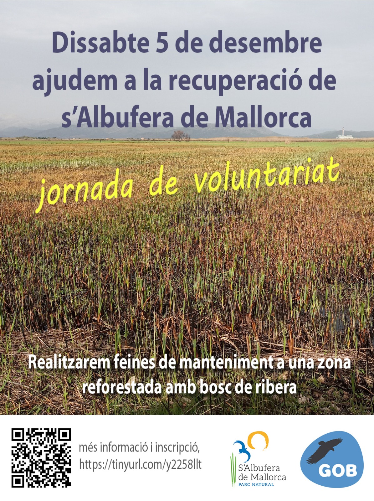 Jornada de voluntariat a s'Albufera Dissabte dia 5 de desembre anirem al parc natural de S'Albufera de Mallorca a una jornada matinal de voluntariat. L'equip d'educadors ambientals del parc ens parlarà sobre la recuperació dels hàbitats després de l'incendi, i la feina consistirà en repassar les repoblacions d'arbres de ribera del camí den Pep i camí den Pujol, substituir protectors i estaques que ho necessitin, fer garangoles als arbres ,... Aquí trobaràs més detalls, i el formulari d'inscripció, que és imprescindible. L'activitat és gratuïta, però les places són limitades.